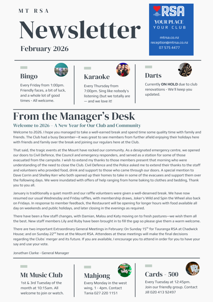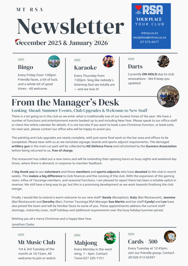 Check back at the beginning of each month for our monthly newsletter. It’s chock full of upcoming events, notices, information for club members and a daily calendar of entertainment so you never miss out on what’s going on at Mount Maunganui RSA.